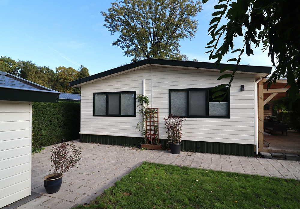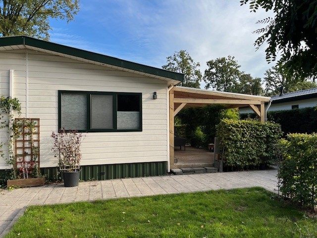 Chalet is gelegen tegen de bosrand aan en is omgeven door veel groen. Verwarming via een CV-combiketel. Laminaatvloer door gehele chalet muv badkamer.